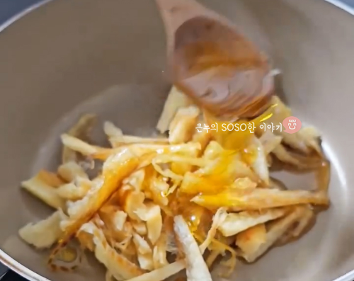 프라이팬에 물에 담궜다가 뺀 황태채를 넣고 매실청 2큰술, 들기름 2큰술을 넣고 볶아줍니다.