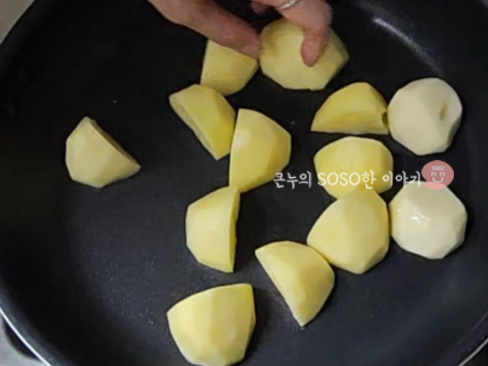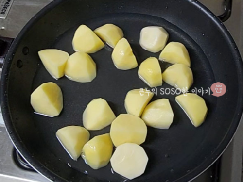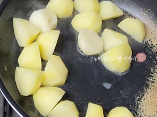 버터 40g을 넣고 버터가 타지 않도록 중약불로 조절하여 10분정도 감자를 굴려 가면서 구워줍니다.