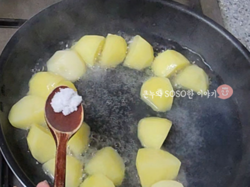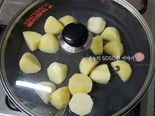 물이 끓기 시작하면 소금 1작은술을 넣고 뚜껑을 덮고 중불에서 삶듯이 물이 사라질때까지 감자를 익혀줍니다.