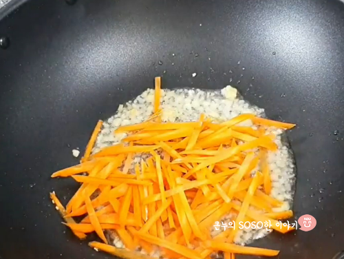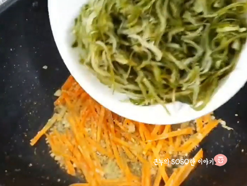 7. 당근넣고 볶아주다가 미역줄기 잘라 넣고 볶아주다가 맛술 1큰술 넣고  볶아줍니다.