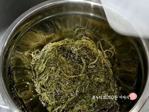 물에 담가진 미역줄기를 살짝 드셔보시고 짠맛이 아주 살짝 있는지 확인해줍니다.
