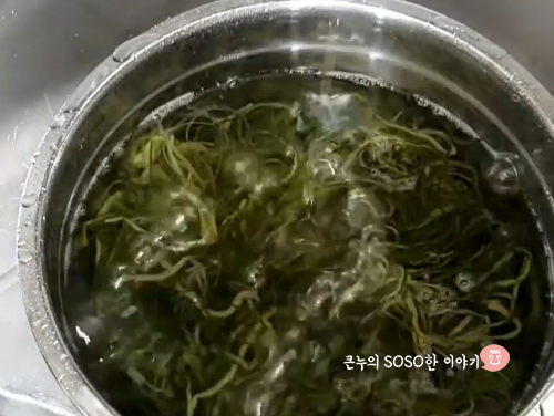 미역 줄기를 끓는 물에 살짝 삶아주면 염장되어 있는