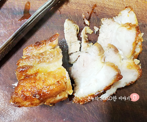 5분 동안 레스팅한 삼겹살을 꺼내 썰어줍니다.