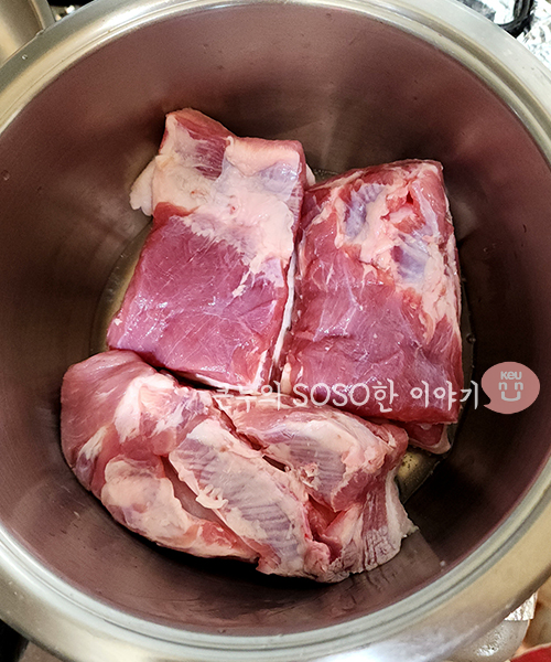 2. 스텐 냄비 예열 후 고기 올려주기