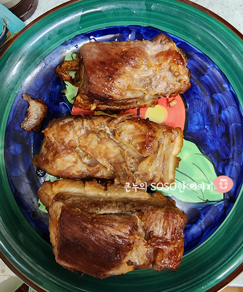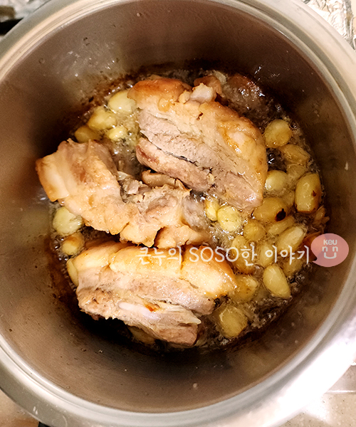 마늘은 꼭 통삼겹살을 사방으로 다 구워준 뒤 넣어주세요. 전 일찍넣었다가 마늘이 나중에 좀 탔습니다.