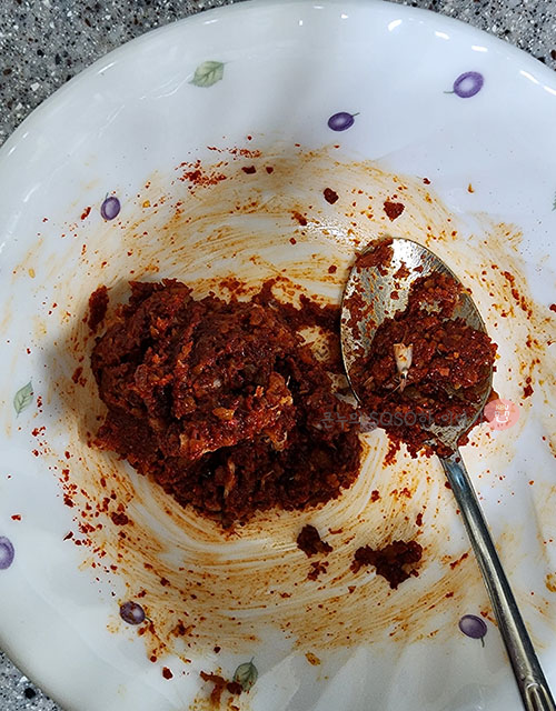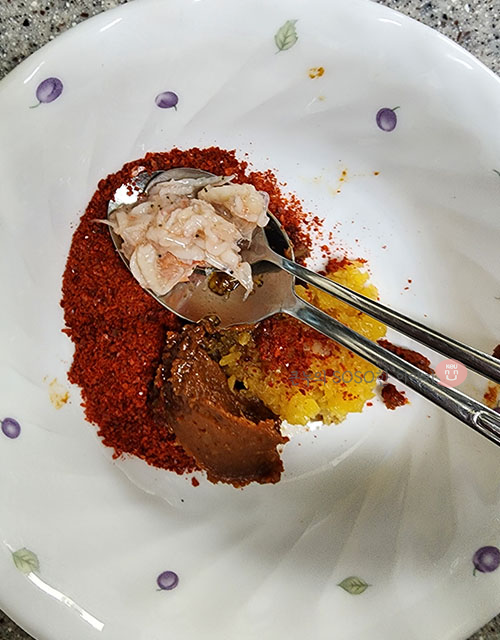 고춧가루 2큰술, 된장 1큰술, 국간장 1큰술, 꽃게액젓 1큰술, 새우젓 1작은술을 넣고 섞어줍니다.