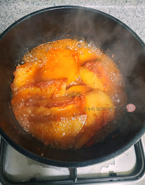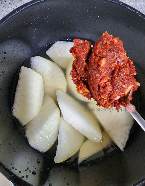 먼저 멸치 육수 500미리에 대충 섞박지처럼 크게 썬 무를 넣어주고 양념장 1큰술 듬뿍 넣어준 뒤 익혀줍니다.