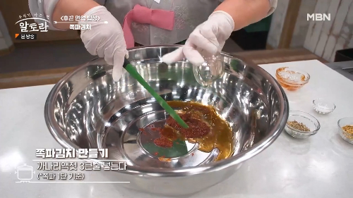 쪽파를 주무르듯이 버무려야 부드럽게 절여진다고 합니다.