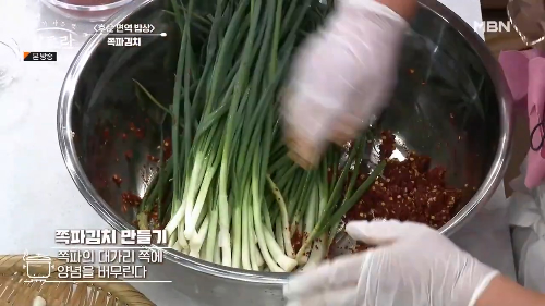 쪽파를 주무르듯이 버무려야 부드럽게 절여진다고 합니다.