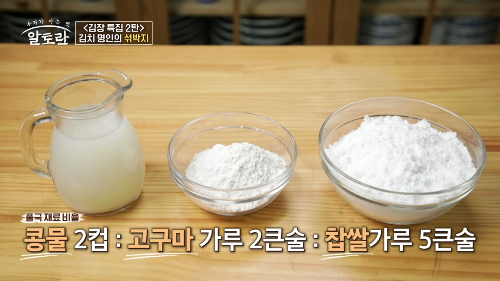 강순의 명인이 만든 풀국은 물 4컵, 콩물 2컵을 넣고 끓여준 뒤 물 1컵에 고구마 가루 2큰술, 찹쌀가루 5큰술을 넣어 풀어 줍니다. 고구마 가루와 찹쌀가루 푼 물을 콩물에 넣어 잘 저어 준 뒤 3분간 끓여 식혀줍니다.