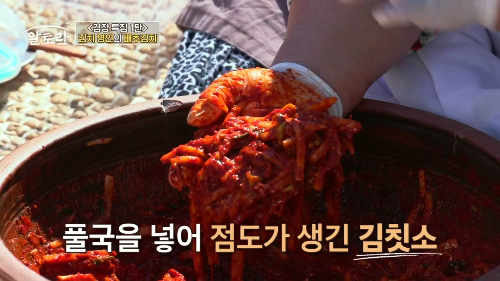 찹쌀가루만 넣으면 김치가 빨리 익는데 김장김치를 오래두고 먹으려면 김치가 천천히 익게 도와주는게 고구마 가루라고 합니다.
