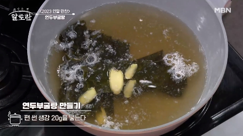 5분 끓여 준뒤 다시마, 생강, 대파 건더리를 모두 건져주세요.