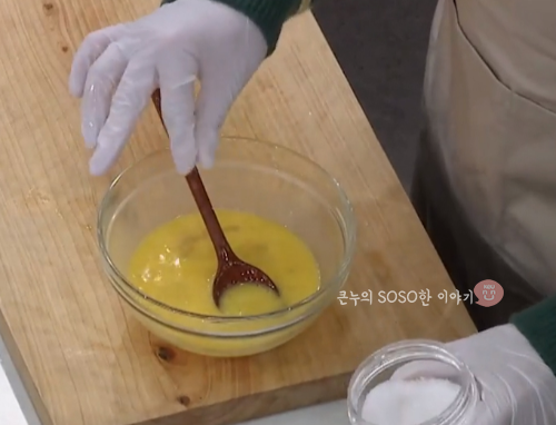 볼에 계란 3개를 깨서 잘 섞이도록 소금 1꼬집 넣고 섞어줍니다.