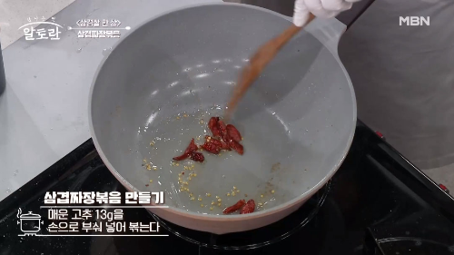 삼겹살을 볶고 걸러낸 기름을 팬에 1큰술 정도 넣고, 손으로 부순 매운 고추 13g을 살짝 볶습니다.