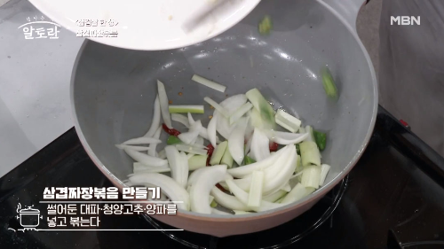 대파, 청양고추, 양파를 넣고 볶다가 간장 1/2큰술을 넣습니다. 간장을 태우듯이 볶으면 불맛이 더해집니다.