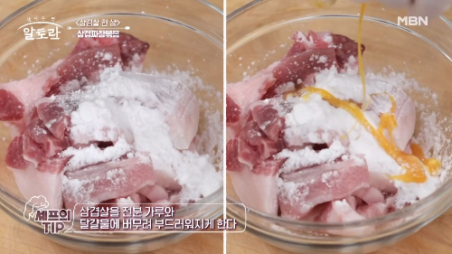 삼겹살 300g을 4~5㎝ 크기로 썰어줍니다. 삼겹살을 전분가루와 달걀물에 버무려줍니다.  전분가룰 살짝만 버무려주면 고기의 부드러워집니다.