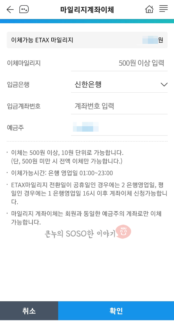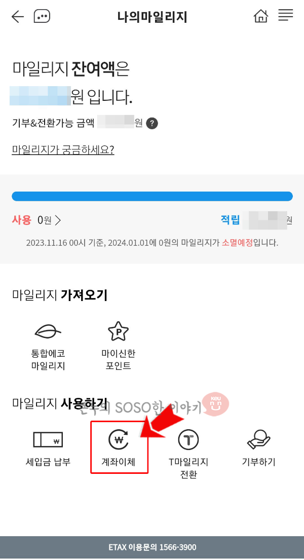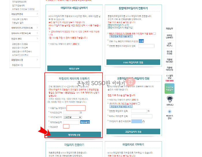 여기서 통합에코마일리지 전환한뒤 바로 계좌이체는 안됩니다.