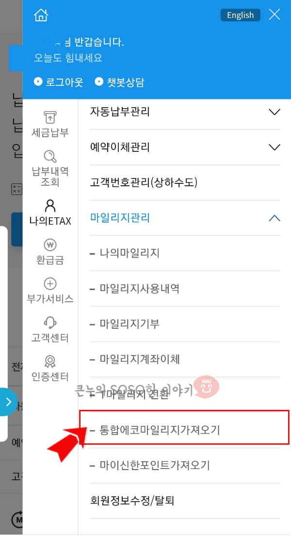 2. 나의 ETAX에서 마일리지 관리 - 통합에코마일리지 가져오기 를 눌러줍니다.