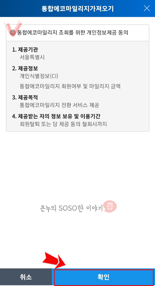 3. 통합에코마일리지 조회를 위한 개인정보제공 동의를 체크하고 확인을 눌러줍니다.