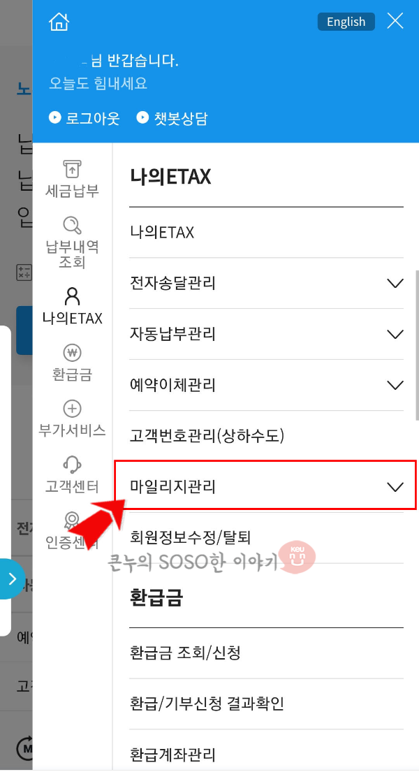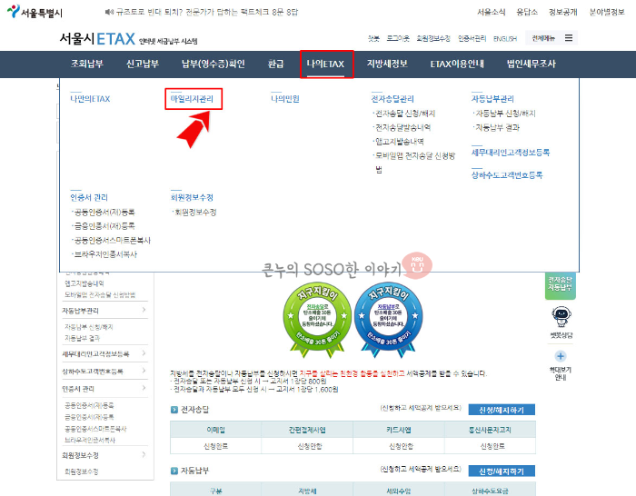 2. 로그인 한 뒤 나의 ETAX 클릭한뒤 마일리지 관리 눌러줍니다.