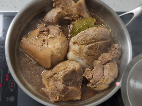 돼지고기 앞다리살 2근을 넣어주고 정육점에서 준 월계수잎도 넣어줍니다. 월계수 잎은 생략하셔도 됩니다.