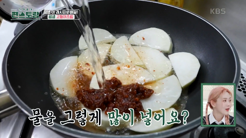 코딩된 궁중팬에 무를 깔고 양념장 2큰술, 물 1ℓ를 넣고 강불로 끓여줍니다.