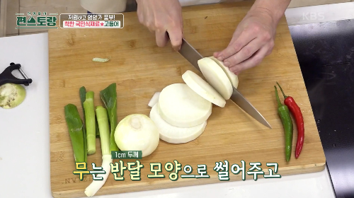 무500g의 껍질을 깎은 뒤  1㎝두께로 자른 뒤 반달모양으로 잘라줍니다.
