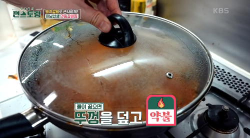 물이 끓으면 뚜껑을 덮고 약불로 40분간 돼지갈비가 부드러워지게 졸여줍니다.
