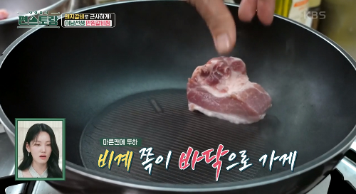 궁중팬을 예열해줍니다. 예열된 팬에 돼지갈비 비계가 있는 쪽이 바닥으로 가게해서 넣어줍니다.