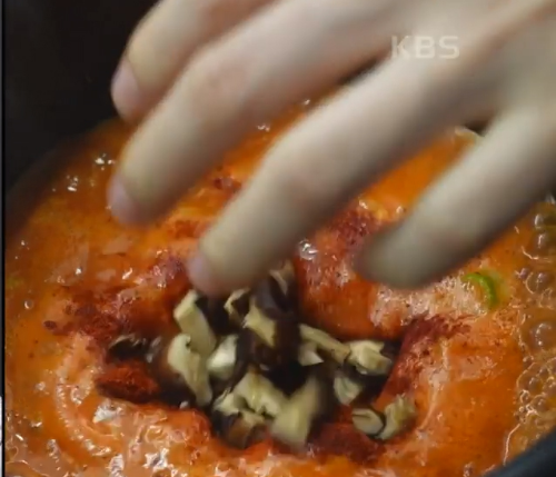 청양고추, 홍고추를 넣고 끓여준 뒤 불을 끄고 들기름 1큰술을 둘려주면 완성입니다.