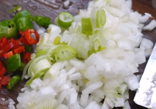 두부는 작게 썰어주고 양파는 잘게 쫗쫑 썰어줍니다. 대파, 청양고추, 홍고추도 잘게 썰어주세요.
