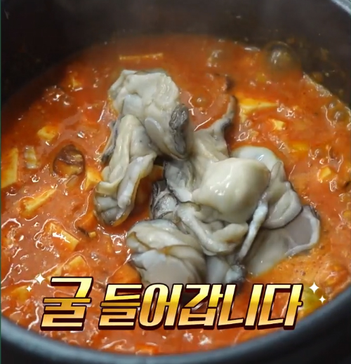 강불을 유지한채 세척한 굴을 넣고 섞지 않고 살살 퍼트리기만 해주세요.