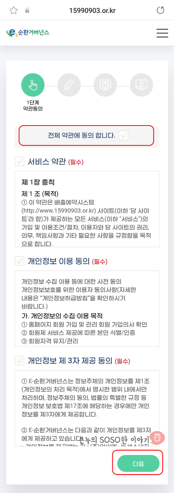 2. [수거예약하기]를 눌러주고 [전체 약관에 동의합니다]에 체크하고 [다음]을 눌러주세요