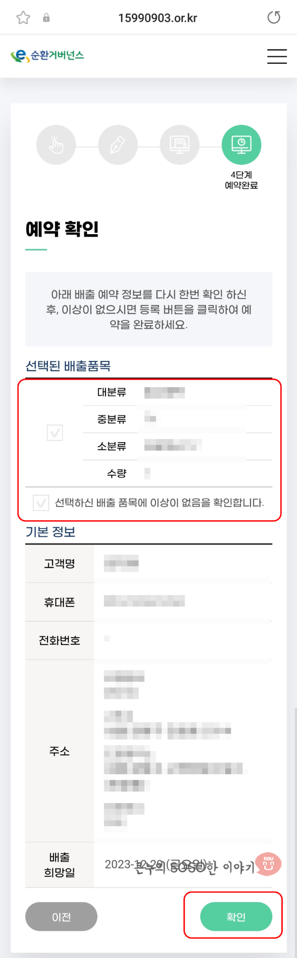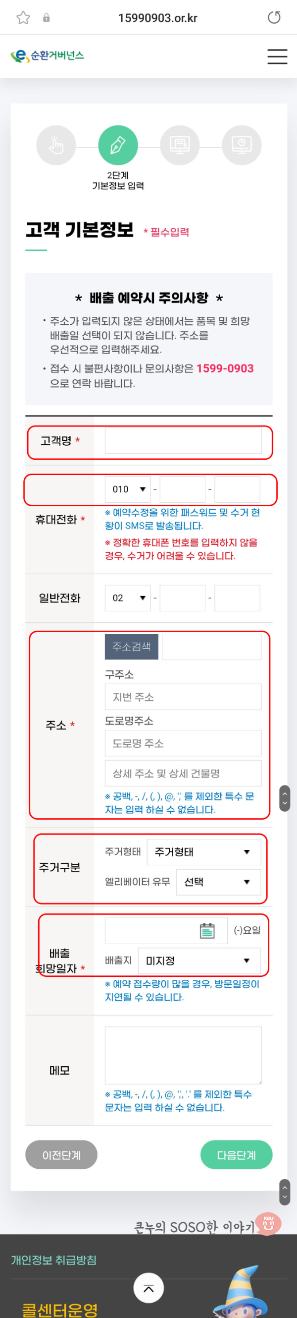 3. 이름과 전화번호, 주소를 작성해줍니다. 주소를 먼저 작성해야 배출 희망일자를 선택할수 있습니다.