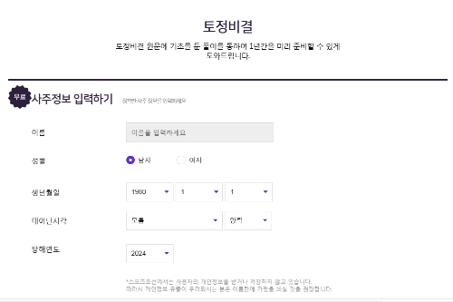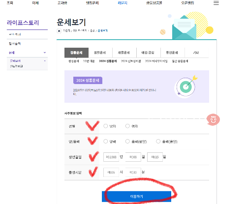 성별, 생년월일, 태언난 시간을 입력 후 2024년을 눌러줍니다.