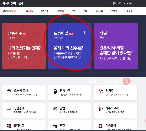 아시아 경제 운세 사이트에서도 무료로 토정비결을 볼수 있습니다. 신년운세는 유료입니다.