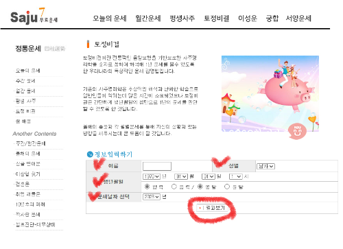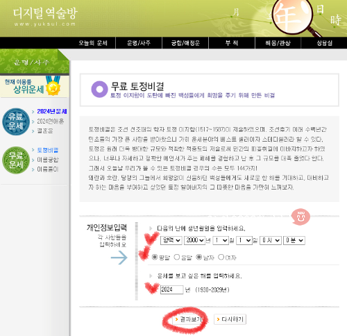 왼쪽에 무료운세에 토종비결 눌러준뒤 개인정보입력에 생년월일, 보고 싶은 해를 입력 후 결과보기를 눌러줍니다.