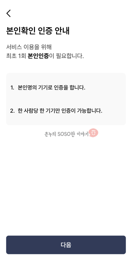 본인 인증은 최최 1회만 본인인증을 하고 본인명의 기기로 인증할수 있으며, 한 사람당 한 기기만 인증이 가능합니다.