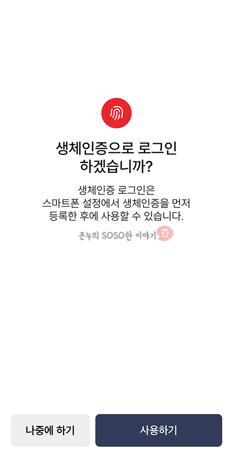 나중에 로그인을 쉽게 하기 위해 전 지문으로 생체등록을 해주었습니다.